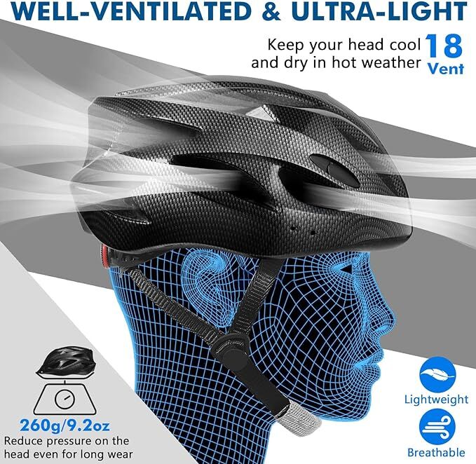 - 18 Air Vents 260g Lightweight: Keeps your head cool and reduces fatigue during long rides.